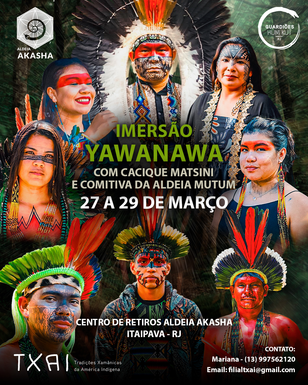 Entre os dias 27 e 29 de março de 2026, a Aldeia Akasha, espaço sagrado nas montanhas de Itaipava (RJ), acolhe a última imersão desta temporada com o povo yawanawa da Aldeia Mutum, localizada no Gregório, Acre.